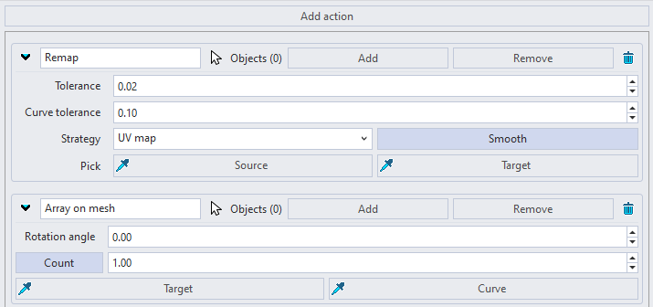 the action is applied to each origin object every time one of these changes. Most of the actions also have a reverse that is applied whenever one of the generated object is changed, this updates the original object to match the generated one. The parameters control how each action is applied to the various objects.