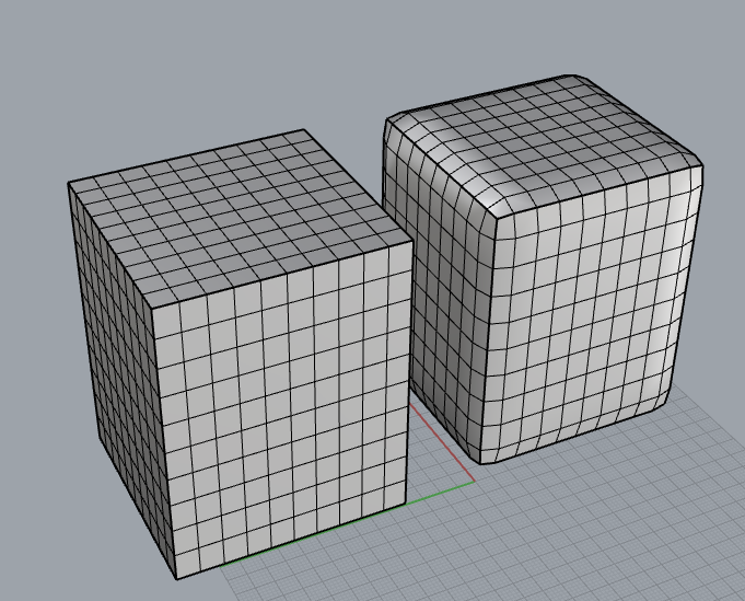 Applies the Catmull-Clark or Rhino SubD subdivision surface algorithm to generate a B-spline surface from the given mesh. The approach implemented is slightly different from Rhino's own SubDs, if you want or need to match other tools that uses Catmull-Clark subdivision surfaces this modifier can help you match your geometry.