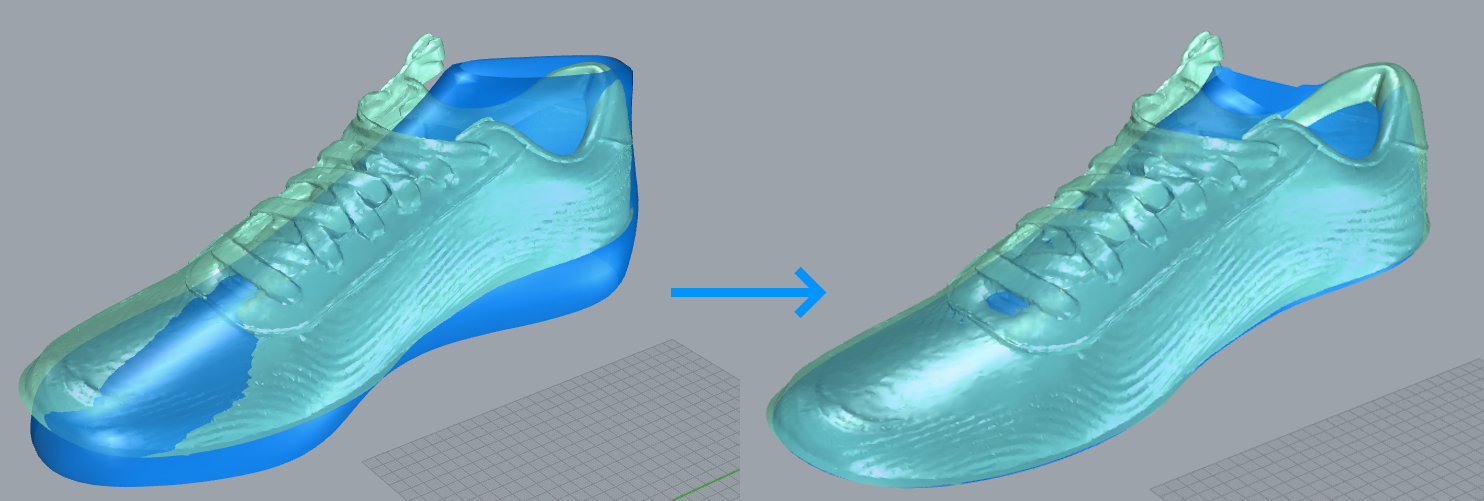 This modifier is particularly useful when building a model from a 3D scan of a shoe. It allows you to fit any last into the mesh obtained from a 3D scan. Simply overlap the rough last mesh and the scanned one and apply the modifier, selecting the scan as the Target mesh.