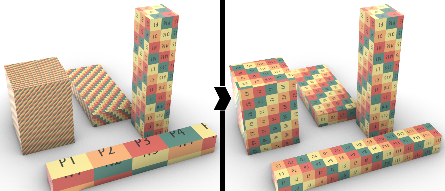 Transfers the UVs coordinates from a source mesh or surface to one or more destination meshes or surfaces. This command is useful when you have many overlapping pieces of the same 3D object and you want the texture to be continuous on their surface. It is possible to choose the prefered transfer method.